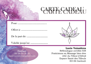 Les cartes cadeaux permettent dâoffrir un moment de dĂ©tente personnalisĂ© : rĂ©flexologie, massages bien-ĂȘtre, drainage lymphatique ou accompagnement maternitĂ©. IdĂ©ales pour un anniversaire, une fĂȘte ou simplement pour faire plaisir Ă vos proches.